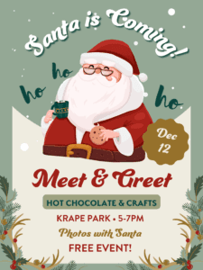 Freeport Park District is ready to welcome him and your family for a festive evening. Join us for a holiday craft, hot chocolate and experience some Christmas spirit at Krape Park.