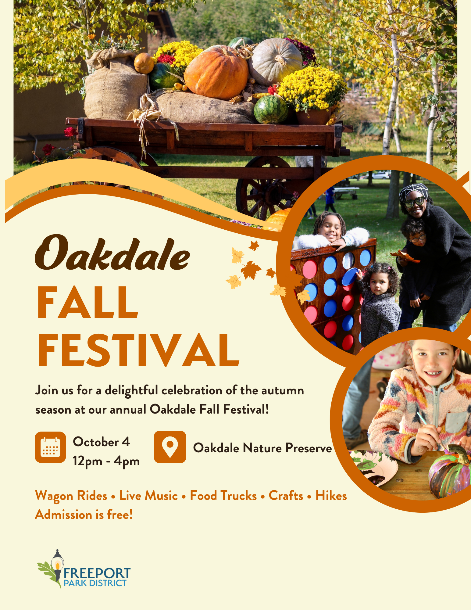 « All Events This event has passed. Save the Date! Annual Oakdale Fall Festival is October 4, 2025 August 26 @ 8:00 am - October 4 @ 5:00 pm « Office Closure Monday, September 1, 2025 in observance of Labor Day Freeport Parks Foundation Presents Autumn Leaf Run: October 4, 2025 » Add to calendar Google Calendar iCalendar Outlook 365 Outlook Live Details Start: August 26 @ 8:00 am End: October 4 @ 5:00 pm